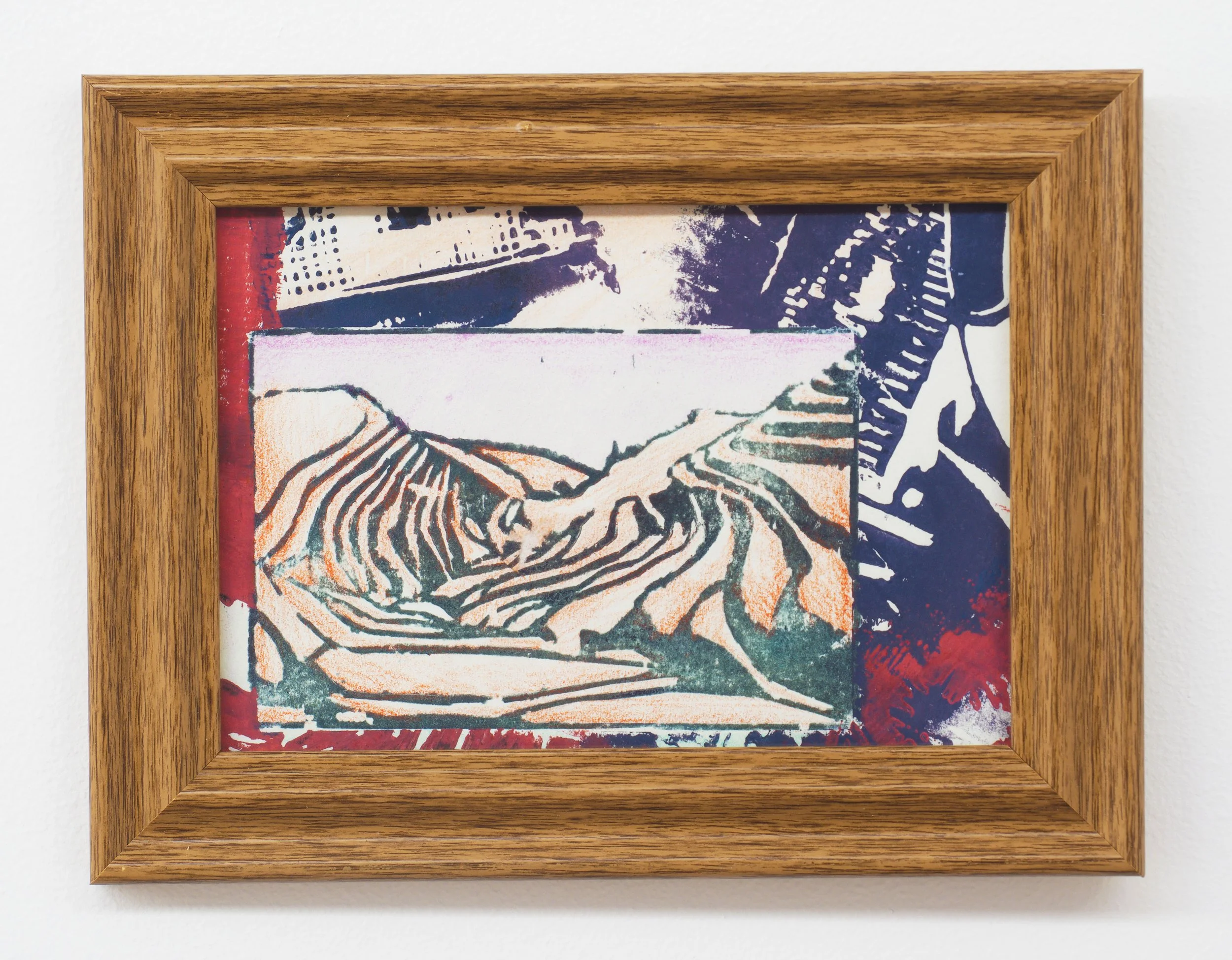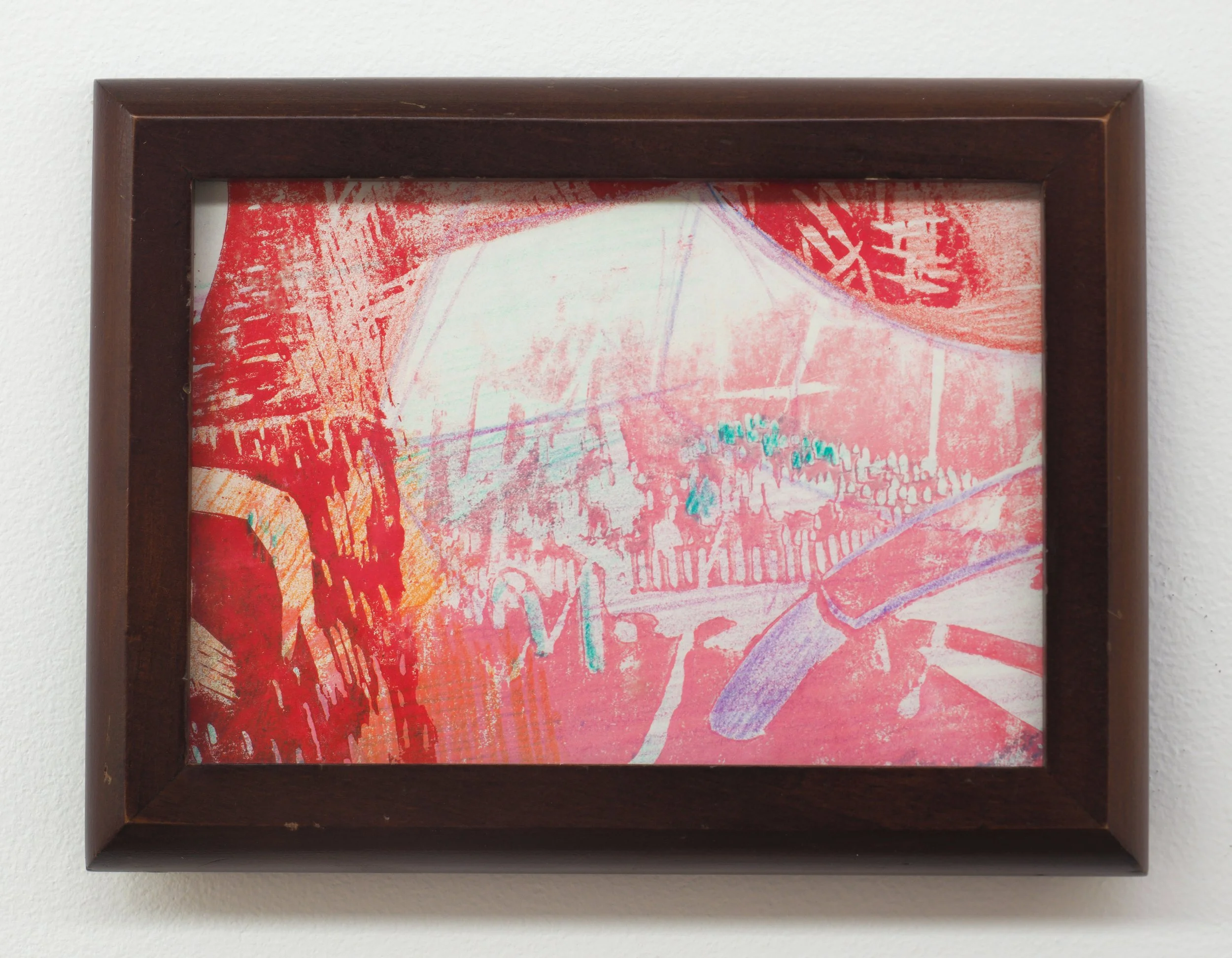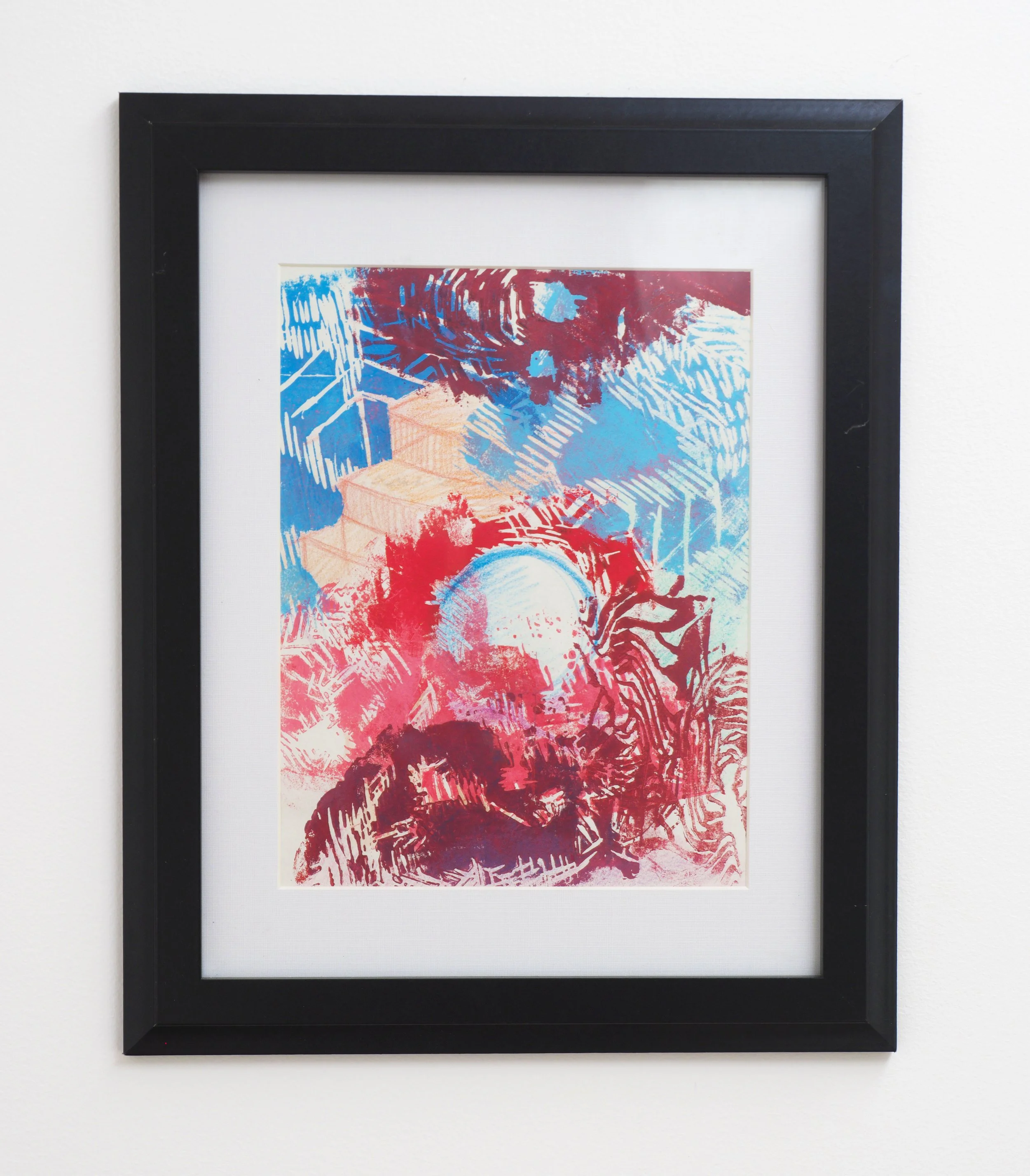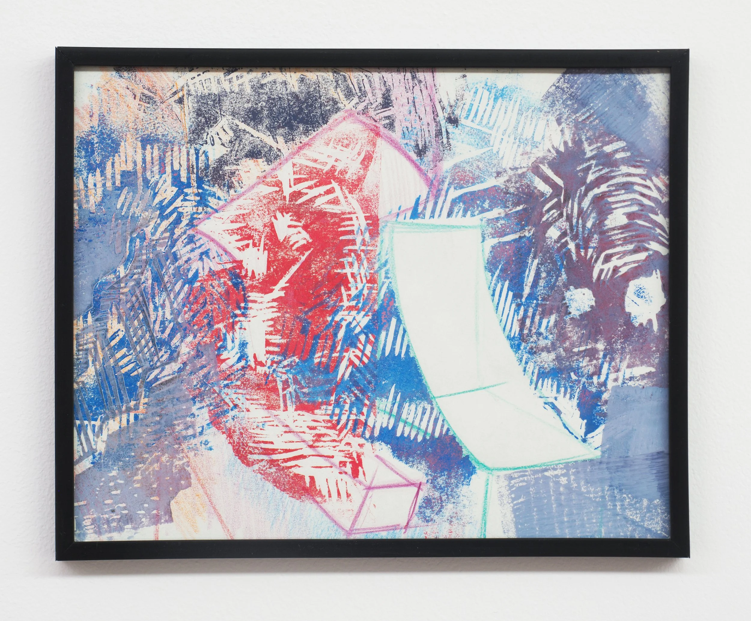 Monotype made from free engraving on recycled skateboard wood. (15 x 22 cm) Artwork presented in 2022 during Émile Phaneuf's solo exhibition titled "Trajectoires Ludiques" at the Limina gallery in Montreal.